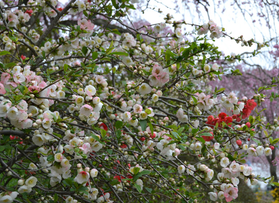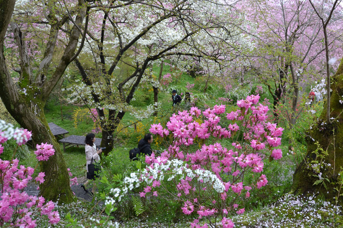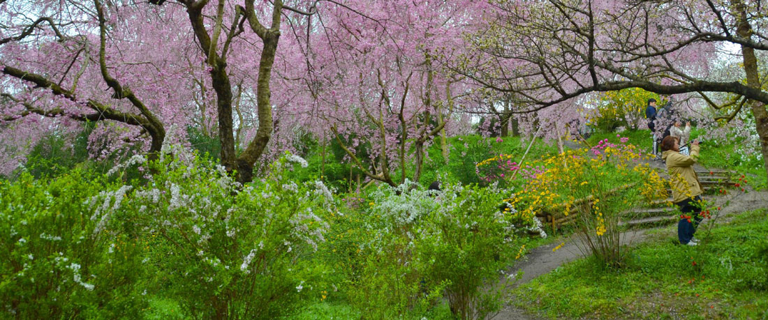| 原谷苑 パノラマ写真 洛北原谷の村岩農園内にある花苑で梅・桜・紅葉の時期のみ一般公開 約4000坪の敷地内には、20数種類の花々に約400本もの桜がギッシリと詰り、「百花繚乱」まるで桃源郷のような光景 今までに見た中で、ここより凄い花見の場所はない。 入苑料金は見頃時1500円 仁和寺の裏でタクシーで1000円 |