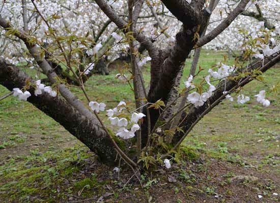 | 背丈が低く地面すれすれから咲く真っ白な御室桜 | |||